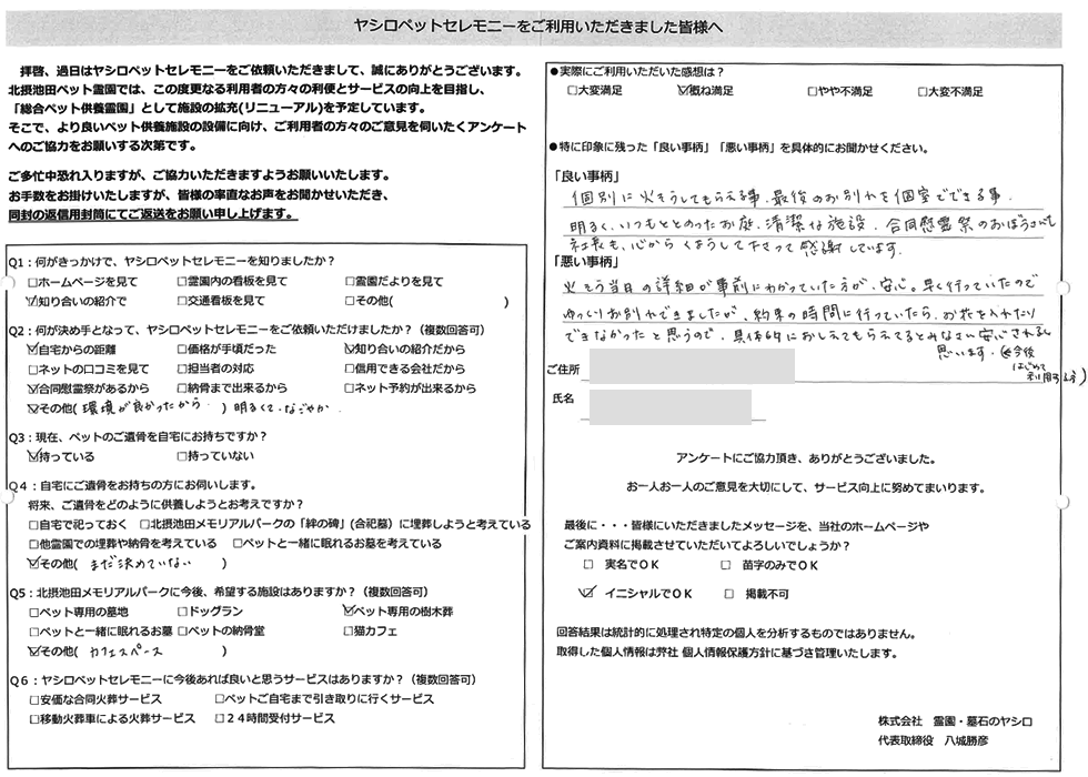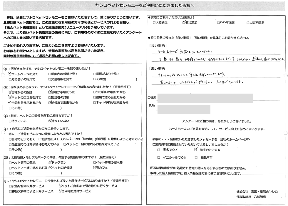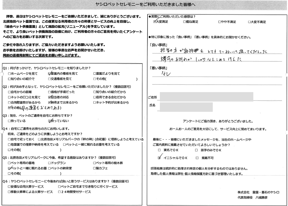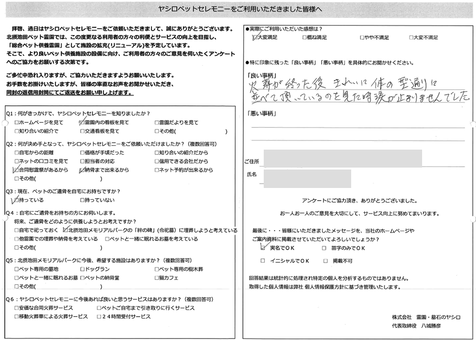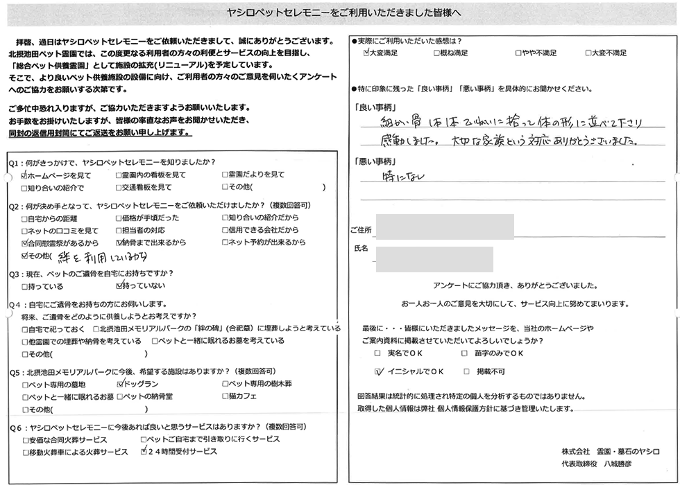 細かい骨1本1本ていねいに拾って体の形に並べて下さり、感動しました。大切な家族という対応、ありがとうございました。