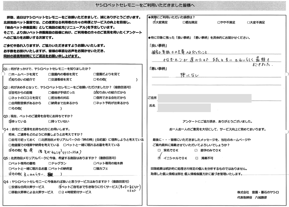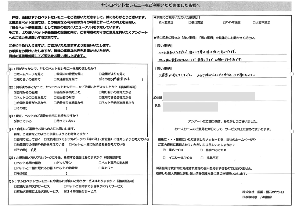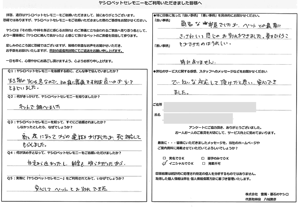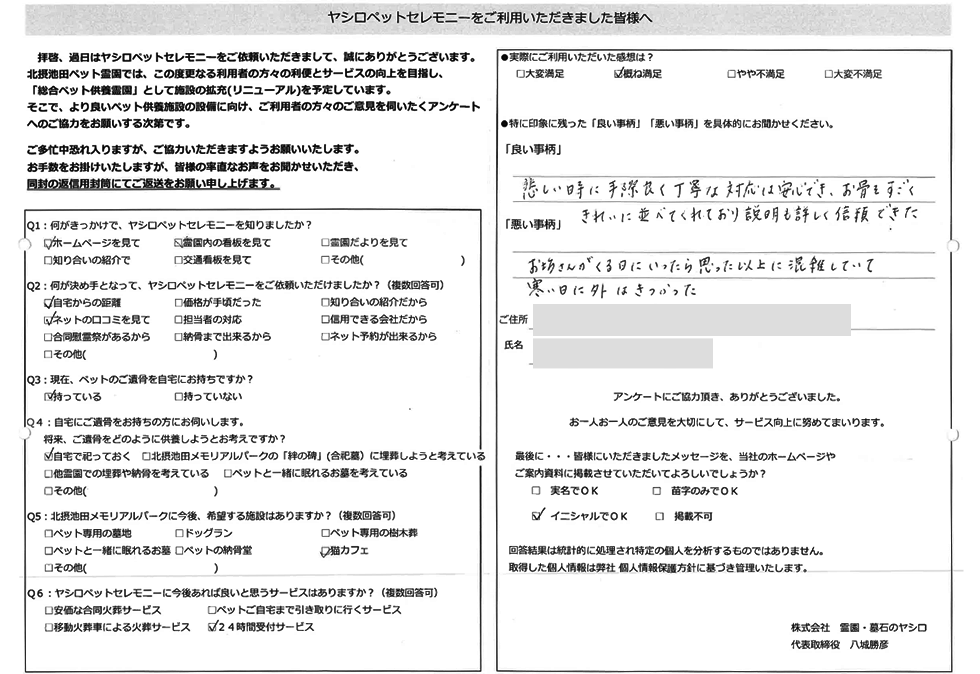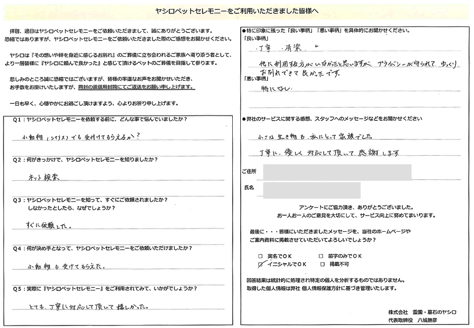 八尾市 N様 この度は当霊園のペット火葬をご利用下さいまして誠に有難うございました。 小動物は小さなハムスターちゃんから受けております。 また完全個別での火葬となっておりますので他の方と一緒になることなく 個室でゆっくりとお別れが出来るようになっておりますのでご安心下さい。