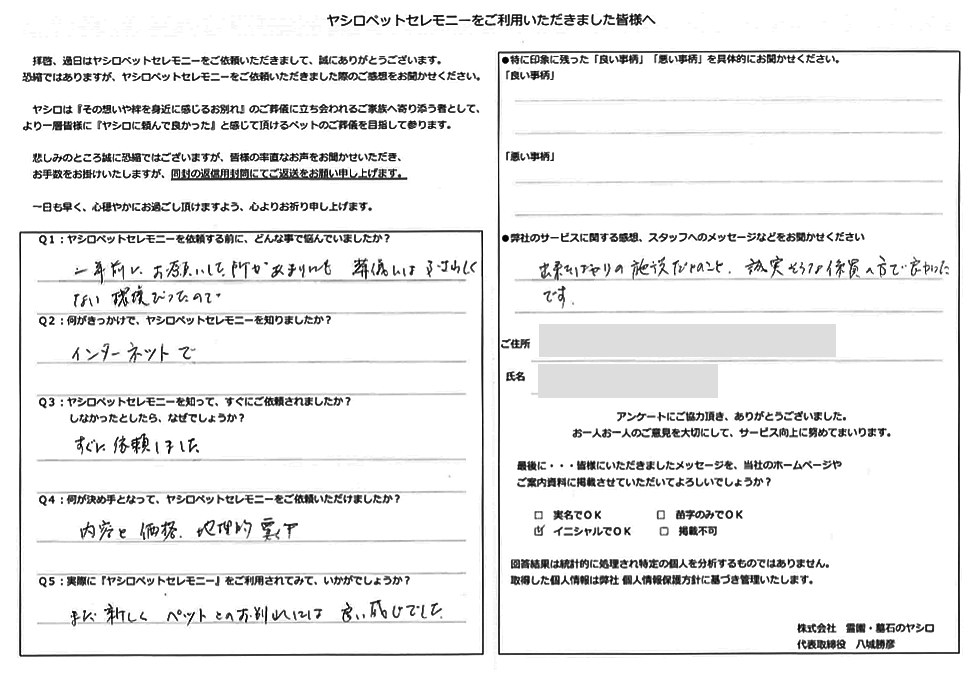 尼崎市 A様 この度は当霊園のペット火葬をご利用下さいまして誠に有難うございます。 お客様のご納得頂ける価格であったようで良かったです。 良かったらまた合同慰霊祭の方にもお越しください。 お待ちしております。