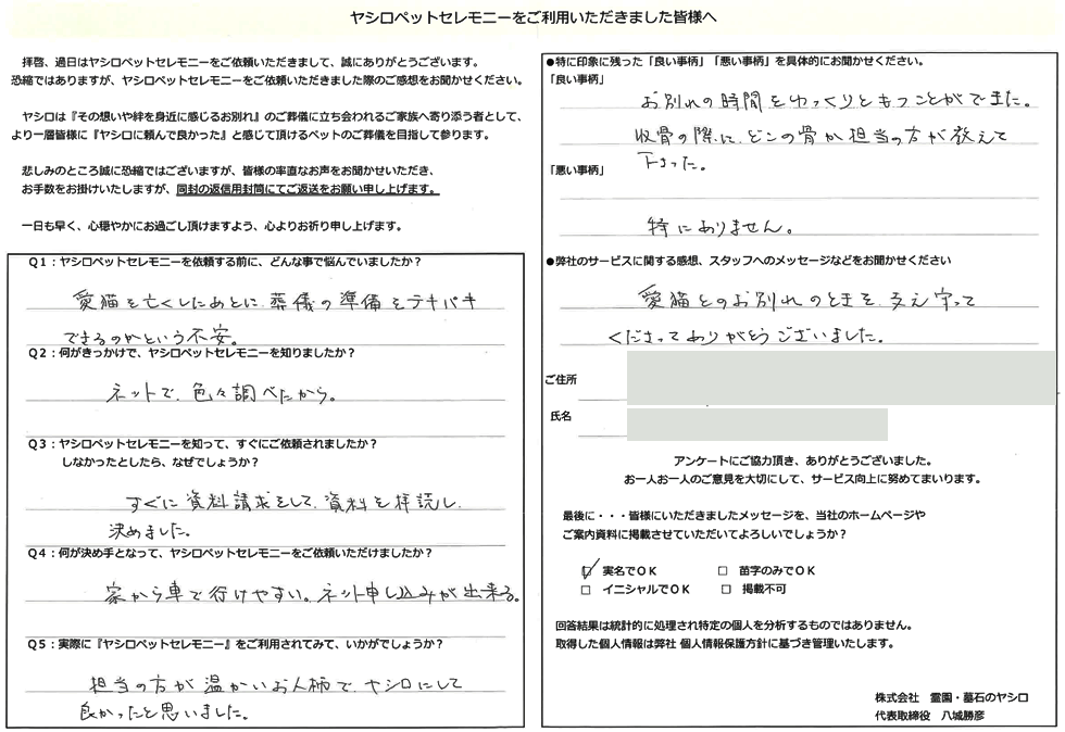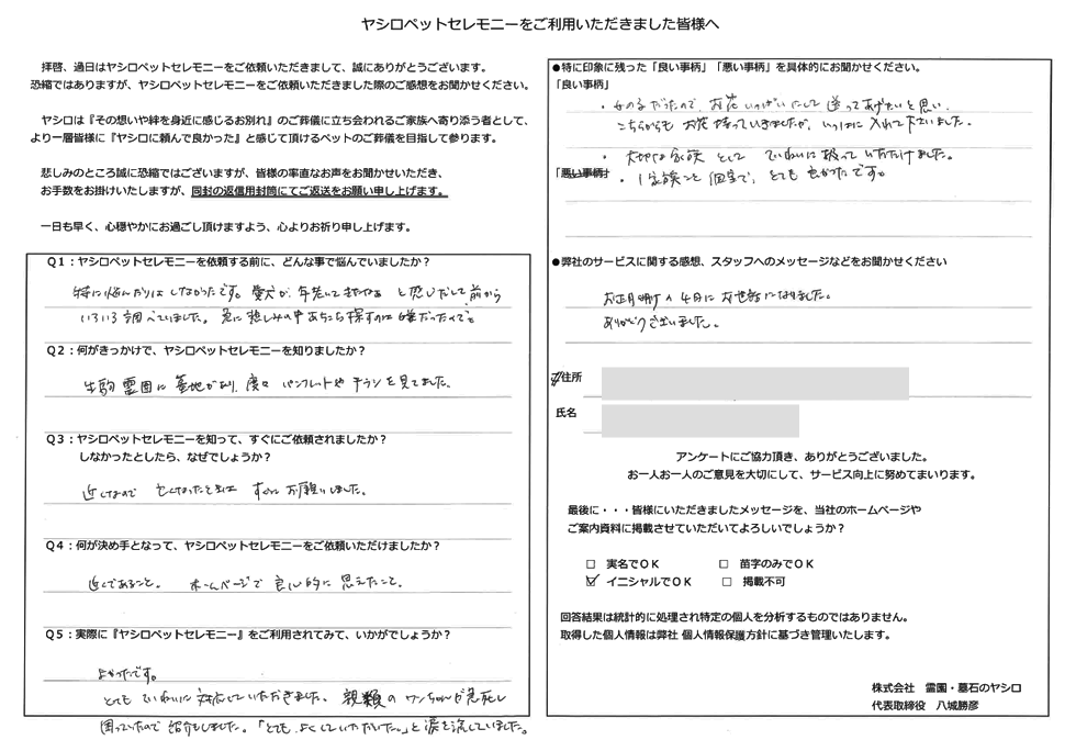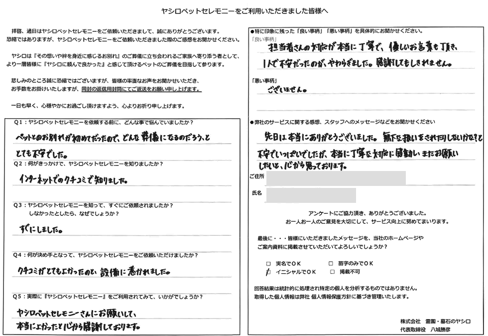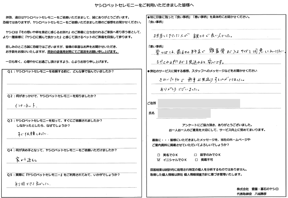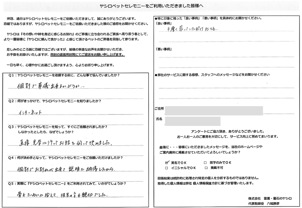 この度は弊社のペット火葬をご利用下さいまして誠に有難うございました。
