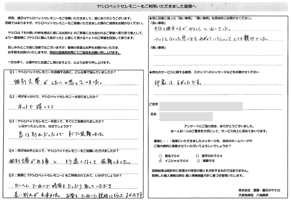 きちんとお別れする事ができて、本当によかったです。ありがとうございました。