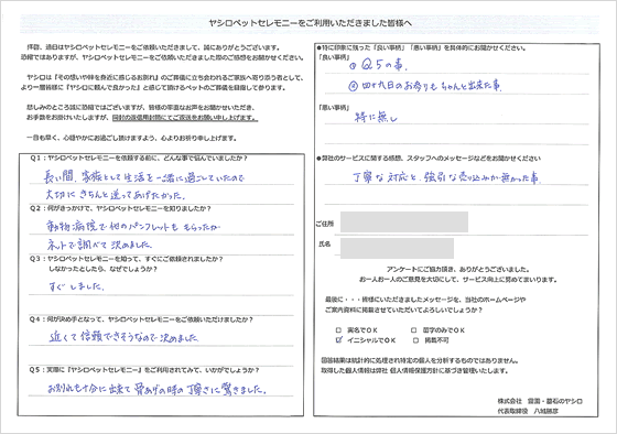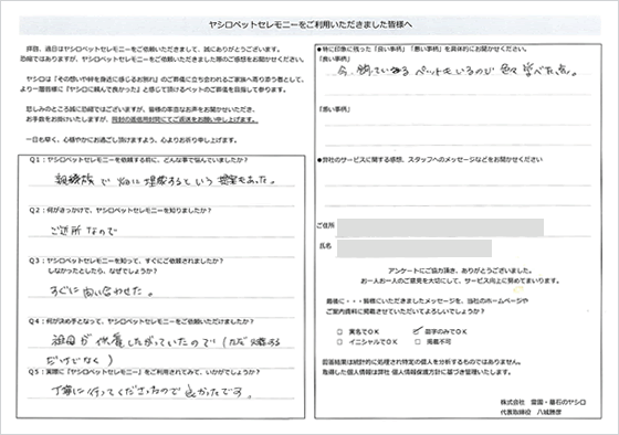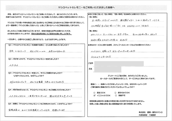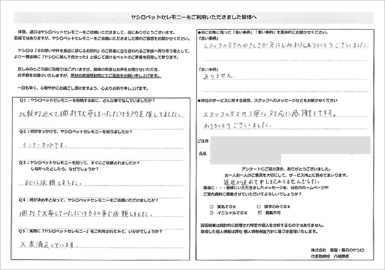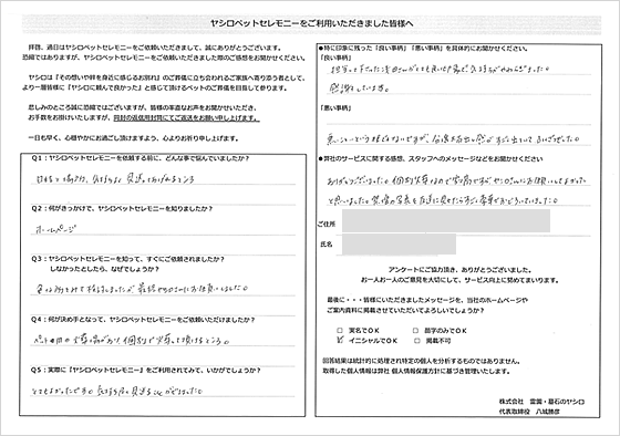ペット用の火葬場があり、個別で火葬していただけて、気持ちよく見送ることができました。ヤシロさんにお願いしてよかったと思いました。祭壇の写真を友達に見せたらすごく豪華で驚いていました。