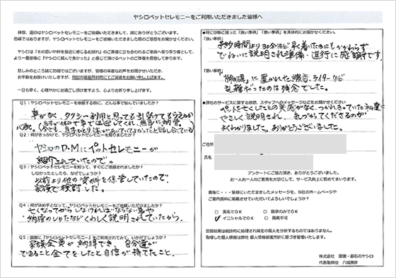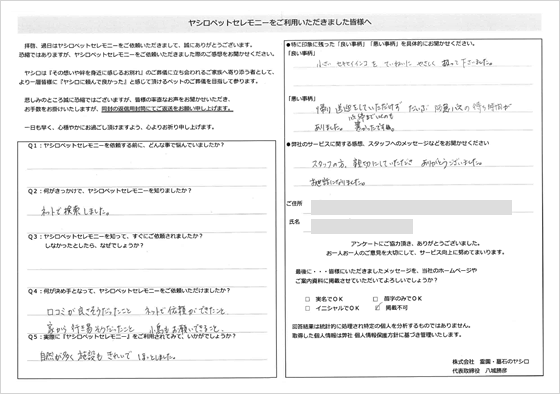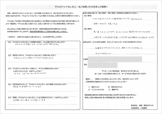 料金体系が分かりやすいです。個別での葬儀だった為、しっかりお別れができたことが良かったです。小動物だからと心配していた骨もちゃんと残っていました。ていねいな対応をしていただきありがとうございました。