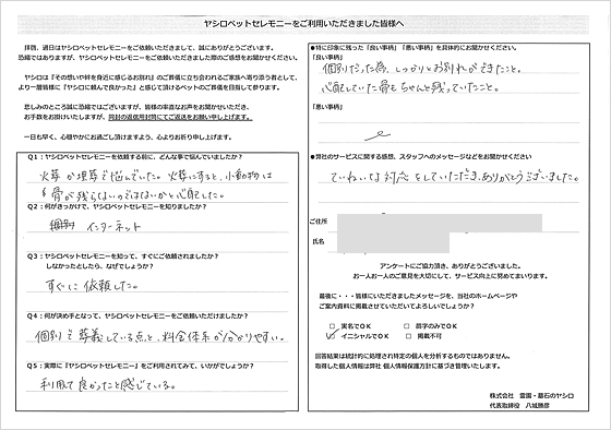 個別でしっかりお別れができました。 心配していた骨もちゃんと残っていました。