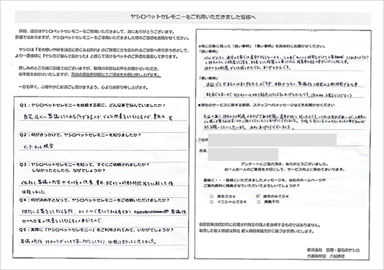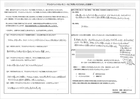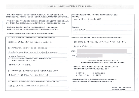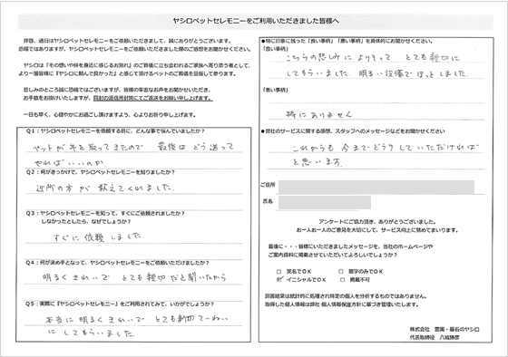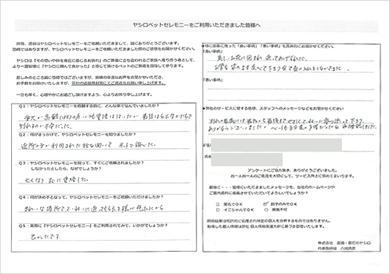 火葬の際のスタッフの方がとても優しくしていただけて、とてもうれしかったです。小さな小さなインコなのに家族のように接していただいて本当に感謝の言葉しかありません。ペンダントも作らせていただき、いつも一緒です。気持ちが切り替えられたのもヤシロさんのおかげだと思います。