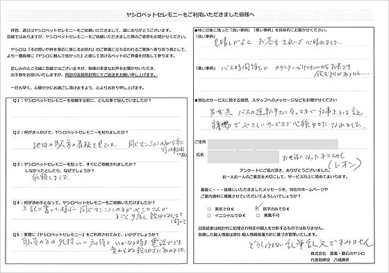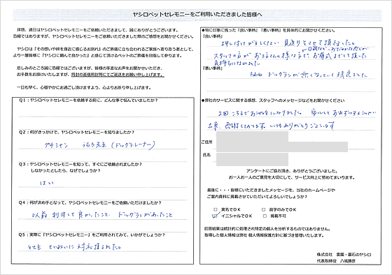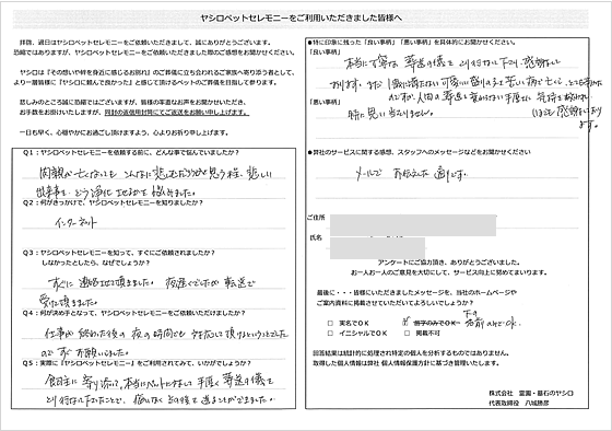 我が子との別れは身を裂かれる思いで、今でも悲しみは癒えておりませんが、ヤシロ様でお世話になれたことで、死を受け入れ「ありがとう」という気持ちで見送ることができました。