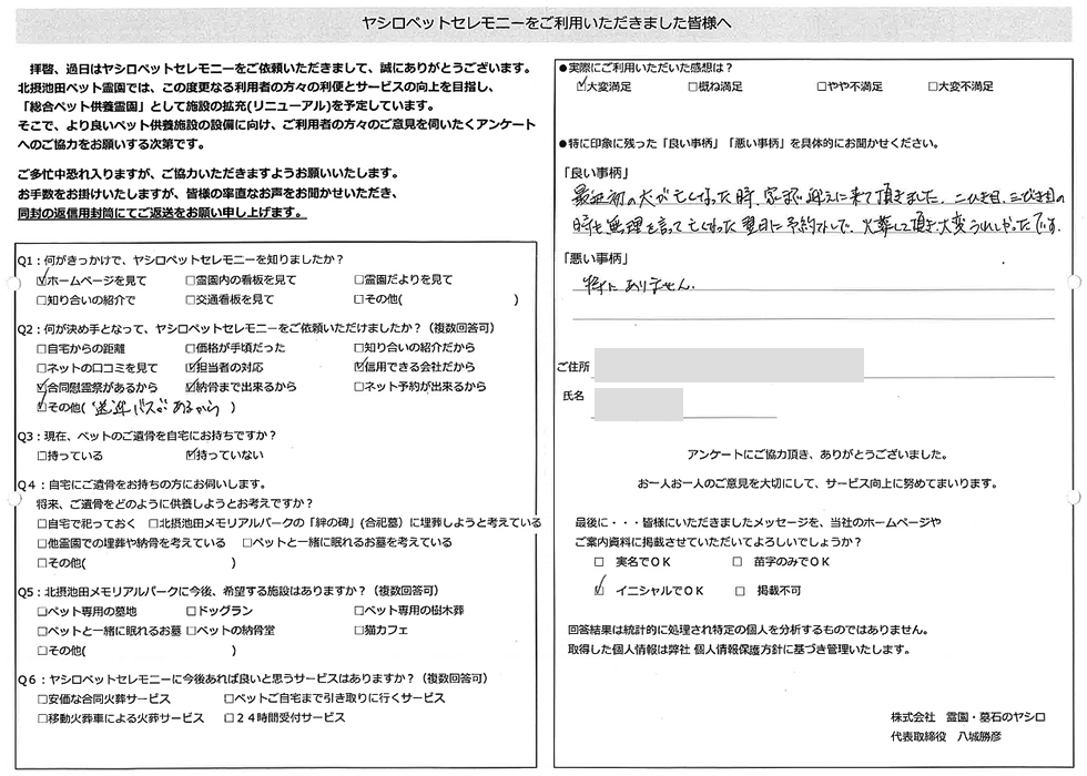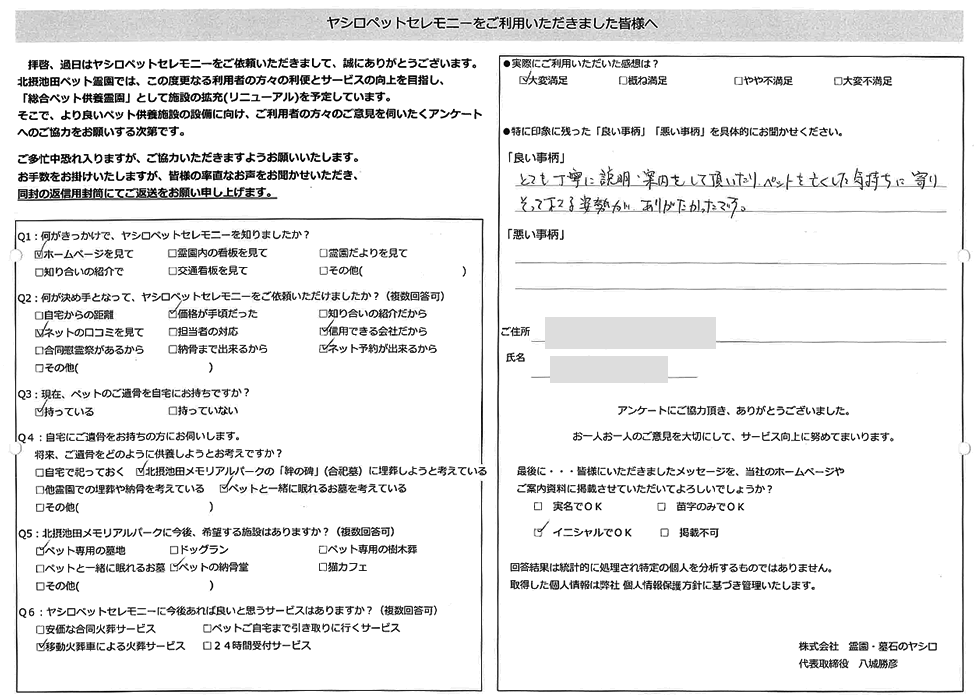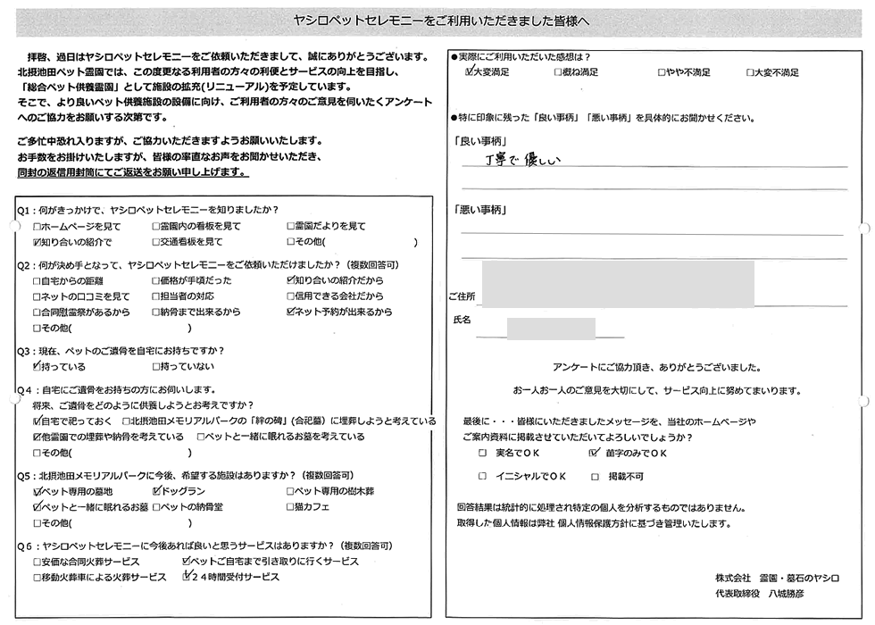 とても丁寧に説明・案内をして頂いたり、ペットを亡くした気持ちに寄りそって下さる姿勢が、ありがたかったです。
