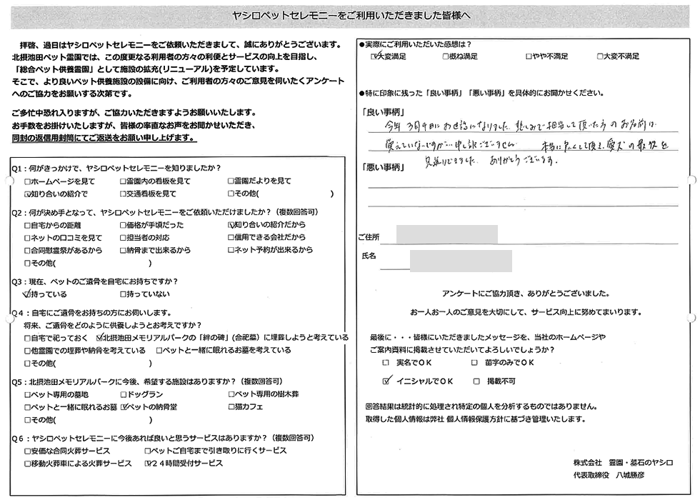 今年3月4日にお世話になりました。悲しみで担当して頂いた方のお名前は覚えていないのですが...申し訳ございません。