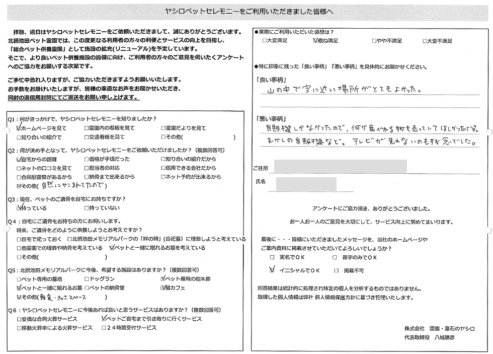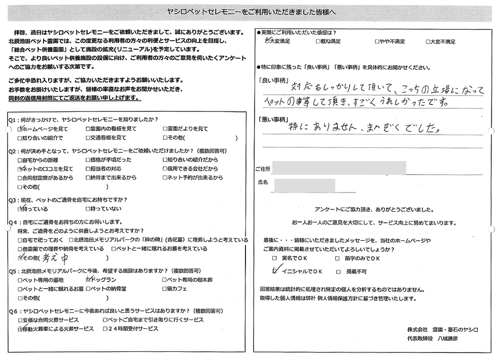 対応もしっかりして頂いて、こっちの立場になってペットの事等して頂き、すごくうれしかったです。