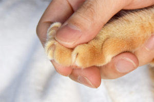 猫の足を上下から指で挟み、肉球をやさしく軽く押して、爪を出します。強く押さえると嫌がるので、力加減に注意しましょう。